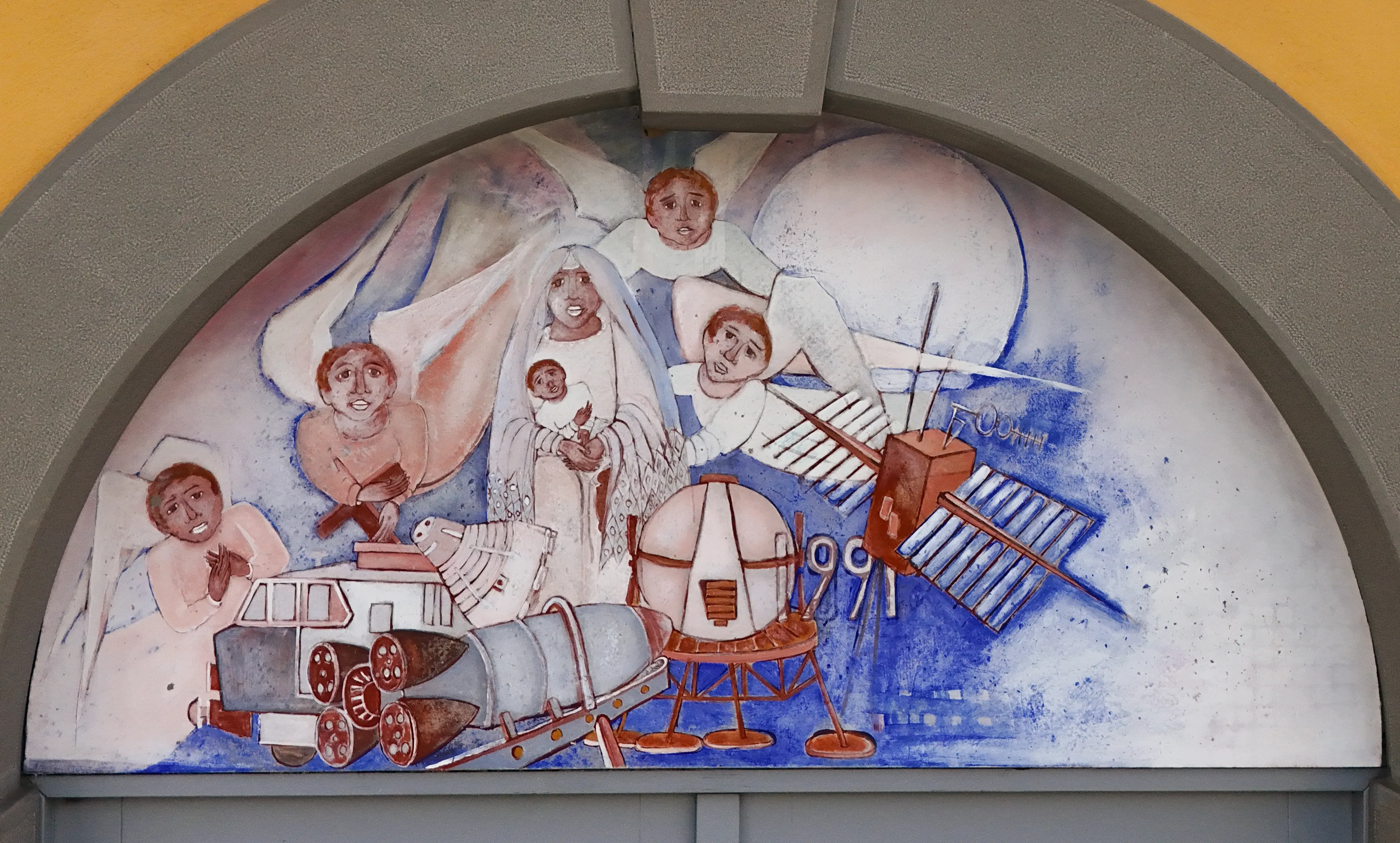 Il secondo affresco riprende il tema del primo, sempre con la presenza degli Angeli Custodi e con i giocattoli ormai dei tempi moderni: capsule spaziali, apparecchi ricetrasmittenti, antenne e pannelli solari.