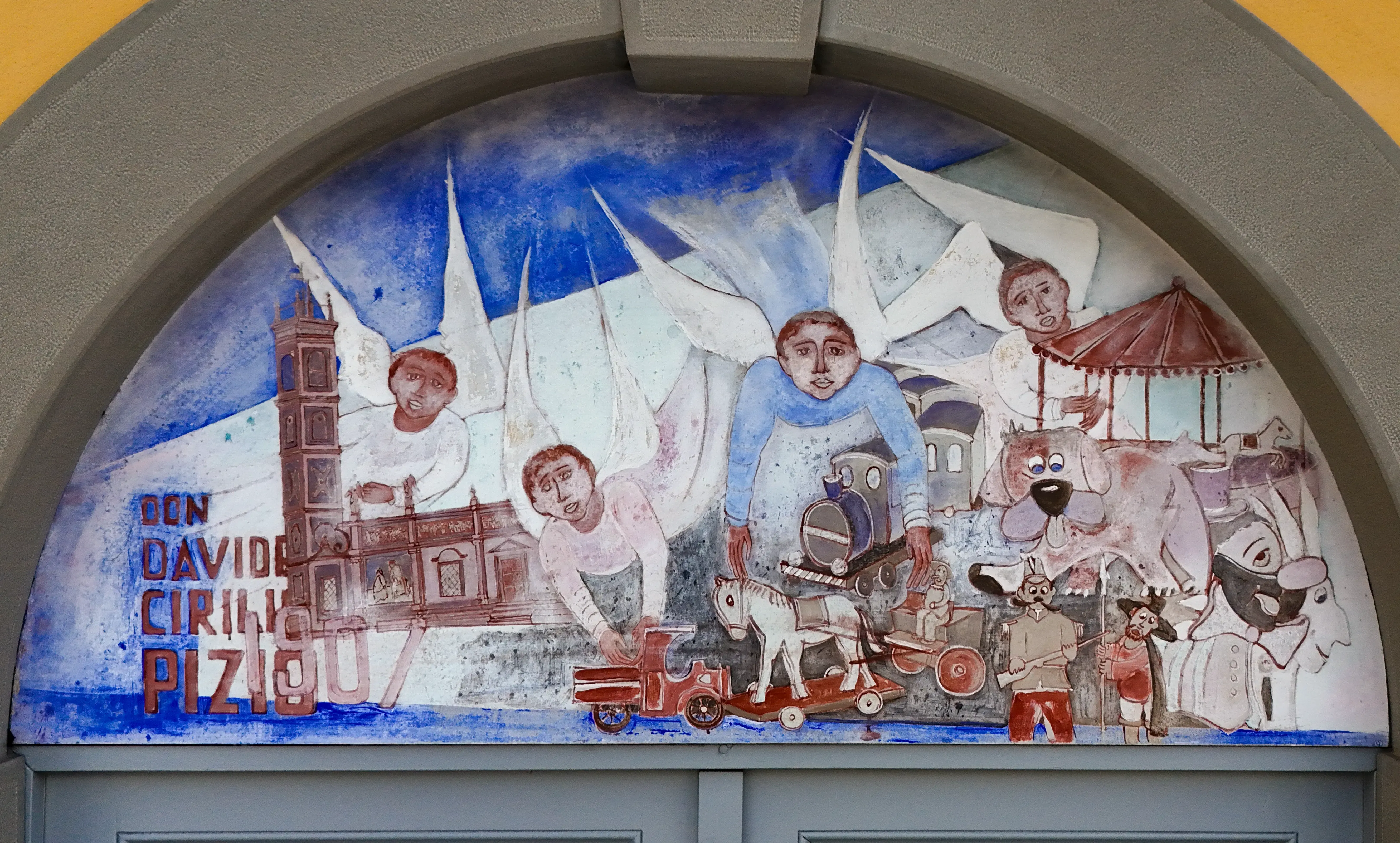 A sinistra del primo affresco, con i nomi dei fondatori, è rappresentata l'antica costruzione, ora demolita, ma della quale rimane il vecchio campanile. Il racconto si svolge per l'intero affresco con raffigurazioni degli Angeli protettori dell'infanzia che assistono i piccoli nella loro innocente ricreazione con giocattoli d'epoca come trenini, automobili in miniatura e piccole “giostre” quasi a significare un tempo che è ormai un ricordo, ma che rimane come testimonianza di giochi fatti di semplicità e, pure, di povertà.